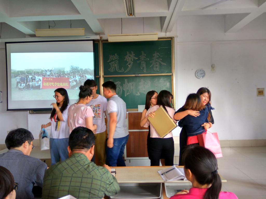 首先,由团总支书记刘毅老师宣读了2017届员工会成员名单。随后,老师们以及员工会全体成员观看了2016届员工会纪念视频。视频过后由各部代表给即将离开的2016届员工会成员送上精心准备的礼物。他们眼含泪水,依依不舍地拥抱,仿佛还有说不完的话,道不完的情,此时,2017届员工会成员异口同声喊出的“学哥学姐,我们爱你!”更是让他们多了一份不舍。