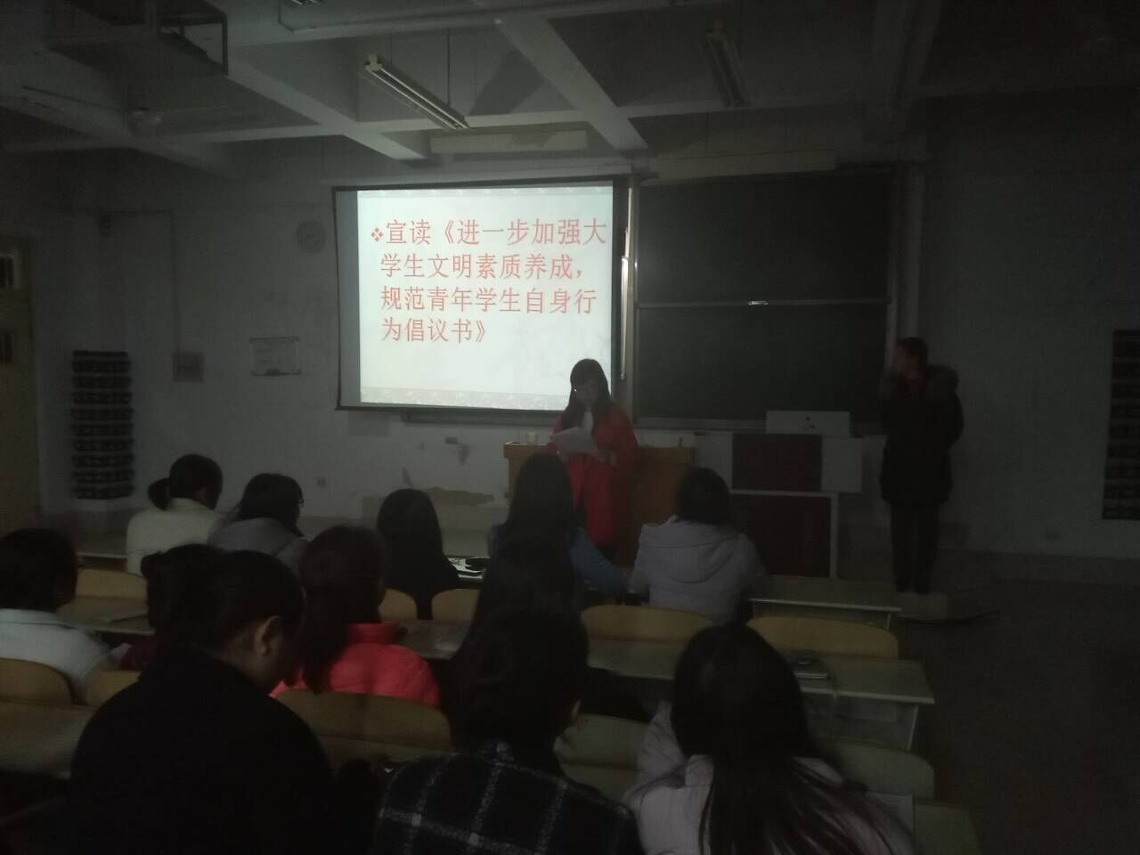 宣读从“查找陋习,恪守礼仪”、“美化校园,净化心灵”、“谨言慎行,自尊自爱”、“一以贯之,自律笃行”、“文明就餐,勤俭节约”、“爱护宿舍,安全自律”等六个方面展开,老师就每一个方面做了具体的阐述并为同学们提出一些基本的要求。