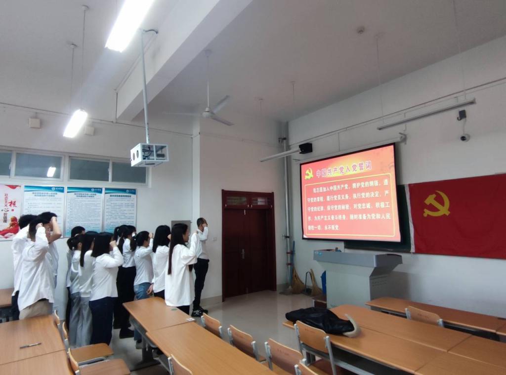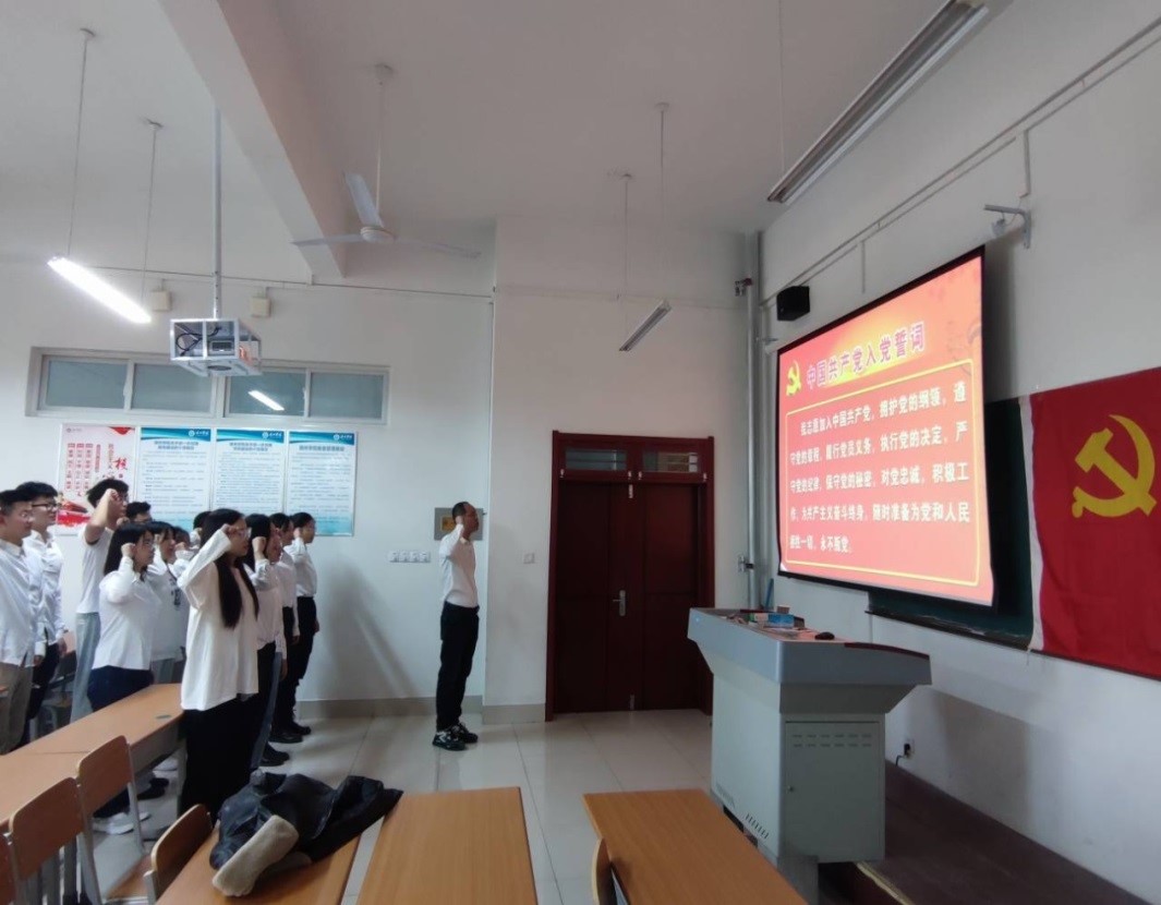 鲜红的党旗,醒目的入党誓词,简而有力地为现场渲染出庄重的气氛。在雄壮的《中华人民共和国国歌》后,宣誓仪式正式开始。此次宣誓仪式由员工党支部书记刘毅领誓,现场顿时响起了阵阵激昂的宣誓声,每个同学都用发自内心的声音抒发对党忠诚的决心,面对党旗,大家接受了一次全身心的洗礼。随后,刘毅书记对新发展的党员提出了几点希望:第一,要加强政治理论学习;第二,要加强党性修养,提高自身素质;第三,要提升科学文化知识和专业知识的素养;第四,更加严格要求自己,时刻保持共产党员的先进性和先锋模范作用。