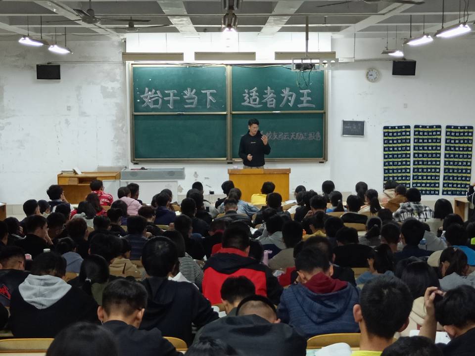 报告会一开始,马云天就问了同学们一个问题“老员工活与高中生活最大的不同是什么?”,依据同学们的回答,马云天由自己刚刚结束的老员工活出发,从进入大学后的学习、生活、工作、友情等不同方面给同学们进行了一一讲解,向同学们诠释了大学阶段对同学们职业生涯发展的意义。同学们听得若有所思。会议进行到问答互动环节,同学们踊跃发言,在一问一答中,一个又一个困扰同学们的问题迎刃而解。马云天用坦诚的态度,朴素直白的话语,向学弟学妹们发出了“纸上得来终觉浅,绝知此事要躬行”的倡议之声,希望学弟学妹们能够明白学习的重要性,尽快适应角色转变,真正规划一条属于自己的大学道路。