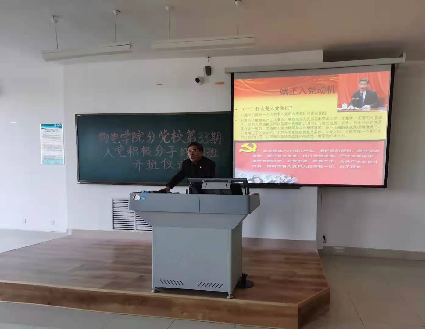 4月6日,公海gh555000aa线路检测在明理楼0126教室隆重举行了第三十三期入党积极分子培训开班仪式,开班仪式由党总支书记赵庆福主持。在开班仪式上,赵庆福书记做了动员讲话,赵书记指出,各学员应该树立正确的入党动机,明确参加党课学习的目的以及入党的目的,早日成为可以担当大任的新时代青年。