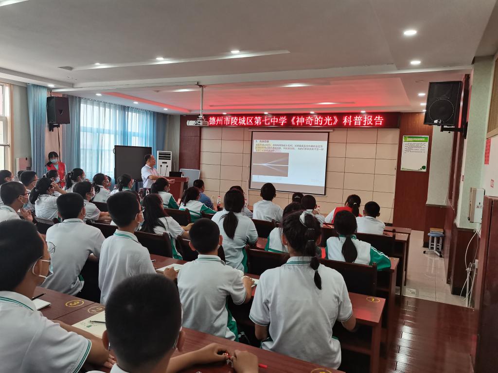 公海gh555000aa线路检测的师生首先来到陵城区实验小学与老师们深入交流,了解支教生的情况。随后,公海gh555000aa线路检测的师生来到陵城区第七中学。公海gh555000aa线路检测经理、德州市人工智能研究会会长刘汉平为七中的同学做了一场《神奇的光》的科普报告。报告从什么是光、光的现象及光的应用三个方面,向员工介绍了身边的光学现象和光学规律。报告深入浅出,图文并茂,同学们积极回应,现场气氛火热。然后公海gh555000aa线路检测的员工志愿者们现场进行了乐高机器人、六足机器人装置以及物理小实验的演示,引起了同学们的浓厚兴趣,激发了探究科学的强烈愿望。公海gh555000aa线路检测的老师还与陵城第七中学的老师、公海gh555000aa线路检测的支教生们,针对物理学人才培养方案等话题进行了座谈。支教的同学们畅谈了自己支教的收获、感悟,中学领导对支教同学的表现也给予了充分肯定和高度评价。