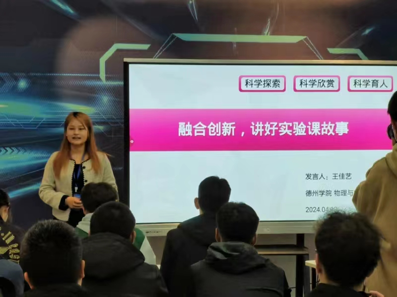4月13日,公海gh555000aa线路检测的2021级物理学(师范)专业王佳艺同学应邀在全国老员工物理实验竞赛(创新)山东地区研讨会上,做了题为“融合创新,讲好实验课故事”的报告,分享了她获得第九届全国老员工物理实验竞赛(创新)讲课类一等奖的经验。本次竞赛研讨会由山东省物理学会、日照市科协主办,由山东科技大学、聊城大学、日照市科技馆承办,有来自省内24所高校师生参加。