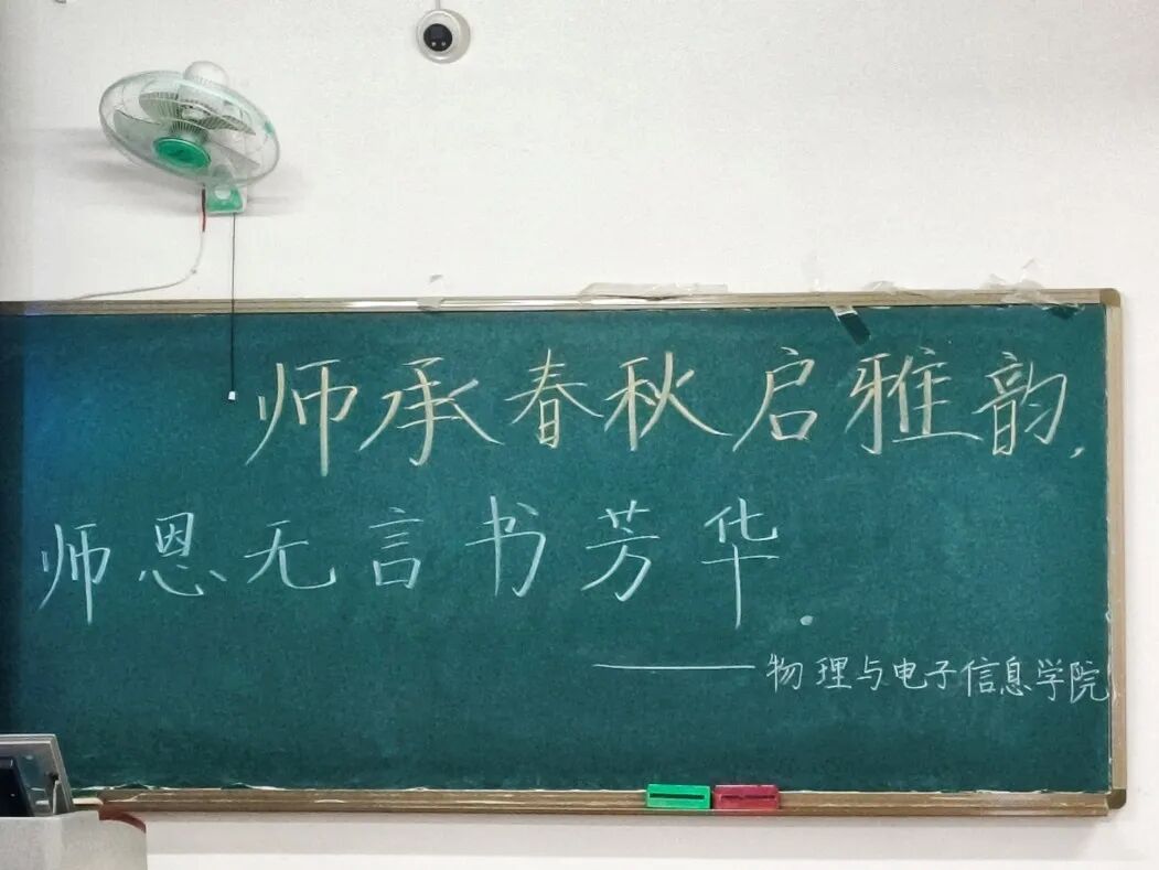 为确保活动有序开展,各班级提前启动筹备工作,通过集体讨论明确分工,细化流程。各班级员工代表提前抵达对应授课教室,以彩色粉笔为创作载体,在黑板上进行精心布置:既书写“师承春秋启雅韵,师恩无言书芳花”“师恩难忘,祝您节日快乐”等饱含敬意的祝福语,又辅以花朵、书卷等象征教育与感恩的图案点缀,将普通黑板转化为传递学子心意的“感恩展示板”。上课预备铃响前,教师步入教室瞬间,全班员工同步起身,以标准鞠躬礼配合整齐划一的节日问候,将预设惊喜完整呈现。教师们在意外之余纷纷展露欣慰笑容,现场氛围庄重而温馨。活动尾声,师生共同在装饰完成的黑板前合影,以影像记录下这一彰显师生情谊的珍贵时刻。