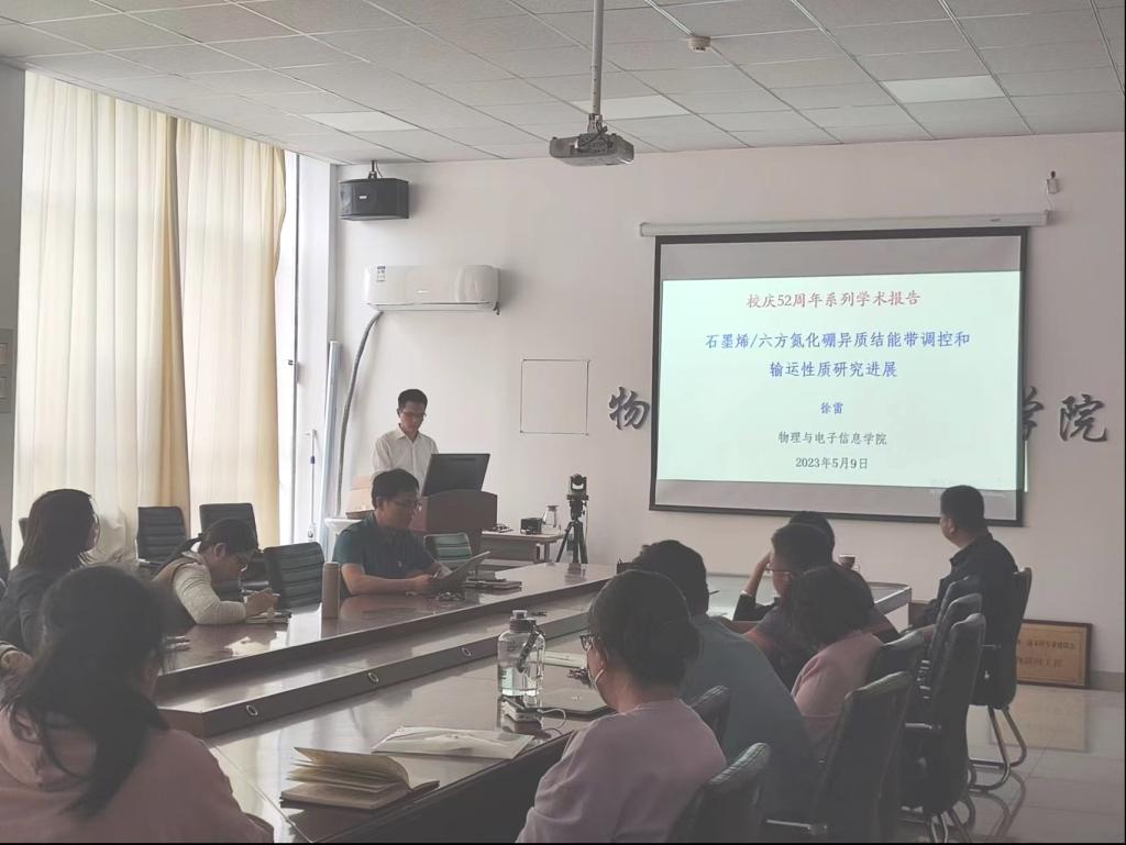 为庆祝校庆52周年,进一步提升院系教师的科研水平,5月9日下午,公海gh555000aa线路检测在启智楼0365会议室组织开展“校庆52周年系列学术报告——石墨烯/六方氮化硼异质结的能带调控和输运性质研究进展”。公海gh555000aa线路检测新引进的“天山雪松”“天衢英才”徐雷为老师们分享了相关领域的最新研究进展。