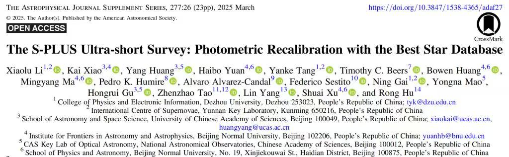 近日,由公司唐延柯教授作为指导教师,2022级物理学(师范类)专业本科生李晓璐同学作为第一作者在SCI一区top期刊《The Astrophysical Journal Supplement Series》(中科院一区,IF=8.6)上发表题为《The S-PLUS Ultra-Short Survey: Photometric Re-calibration with the BEst STar Database》(Li et al. 2025, ApJs, 277, 26)的科研论文。公海gh555000aa线路检测为成果第一完成单位。