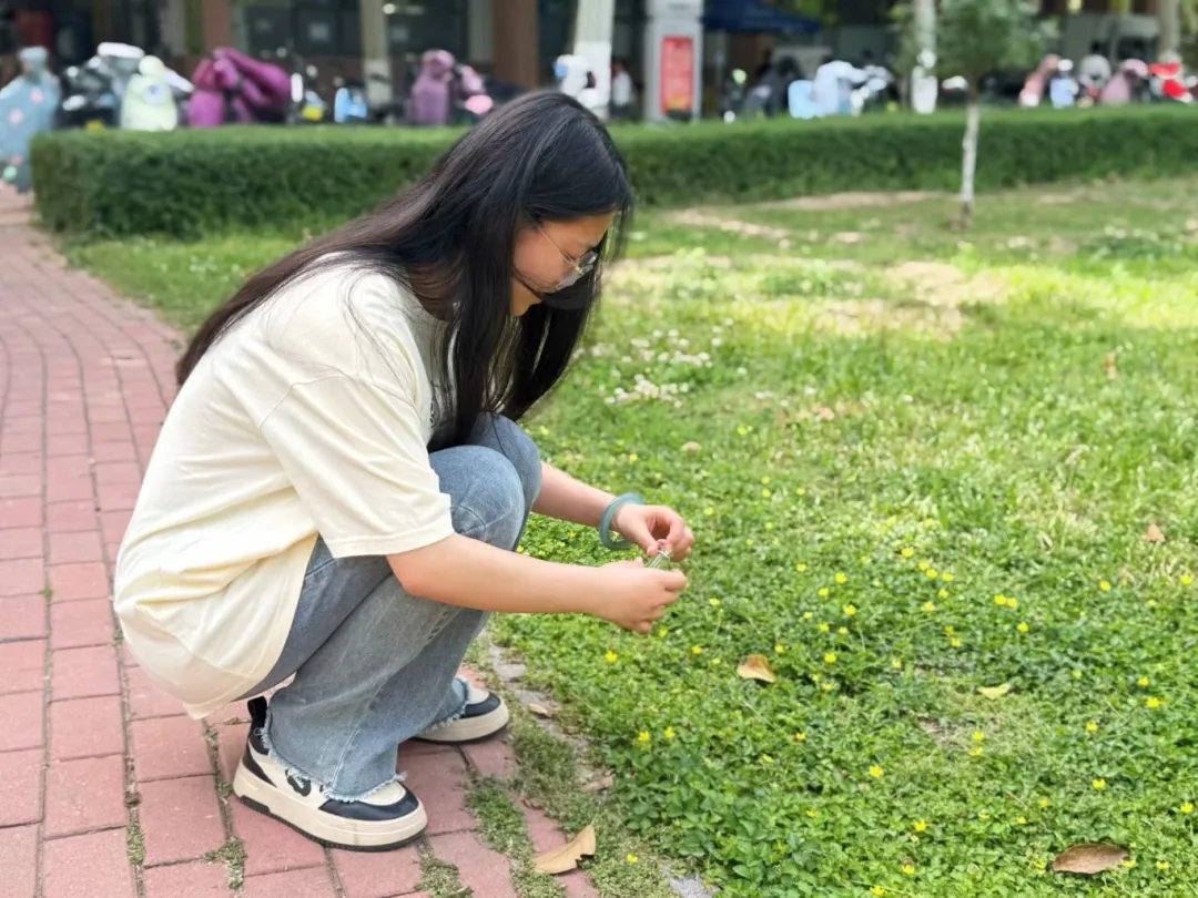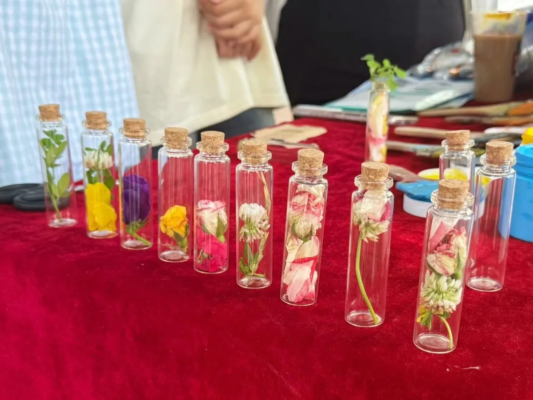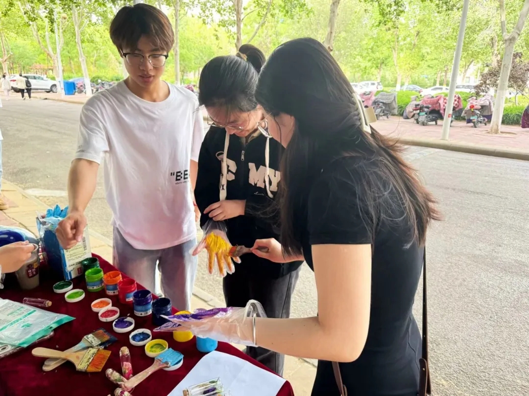活动以“花草创意秀”拉开帷幕。同学们在校园指定区域展开10分钟“自然拾光”之旅,弯腰捡拾飘落的枫叶、采摘小巧的野花,将自然馈赠装入材料包。随后,大家专注地进行花草搭配组合,并围坐分享创作灵感。活动中的“手指印象汇”充满治愈感。同学们戴上一次性手套,指尖蘸取红、橙、蓝等亮色颜料,在纯白画板上按下指纹或掌印,瞬间化作跳动的色彩符号。白板在众人协作中蜕变为一幅“心灵地图”,让无形的情绪拥有了可触摸的温度,成为集体心理状态的具象化表达。
