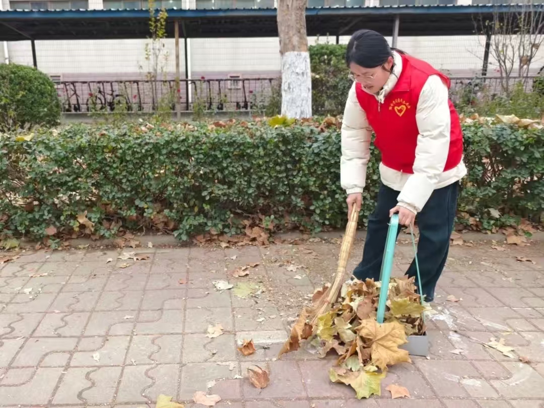 在清扫活动中,同学们按需分配清扫工具,划分小组分头行动,认真仔细、有条不紊地进行着清扫任务。他们有的挥起扫帚,清扫小路上的落叶,有的扛起耙子,将草坪中的落叶聚到一处,再装袋运走.清扫现场井然有序,大大加快了工作进程,提高了工作效率。经过大家近一个小时的辛勤劳动,小路上与草坪中堆积的落叶便被清理一空,校区环境得到明显改善。