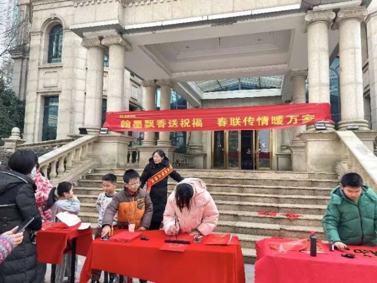 有的同学志愿走进社区,与社区居民进行一对一结对,专注指导居民书写春联。他们耐心地帮助居民纠正书写姿势,细致讲解笔法运用,分享春联的书写技巧。在志愿者的指导下,居民们满怀对新年的美好期许,挥毫泼墨,将祝福融入一副副春联之中。活动现场墨香四溢,欢声笑语不断,处处洋溢着喜庆的节日气息。