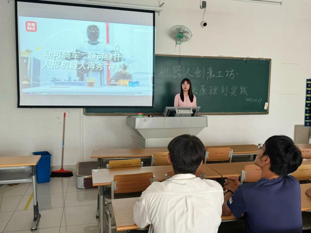 活动中,主讲人以生动易懂的语言开启理论讲解环节。从人形机器人模仿人类身体结构搭建的关节、肢体基础构造,到依赖先进算法与精密传感器实现的运动控制,再到作为“大脑”的控制系统如何基于数据做出决策,系统性地阐述了人形机器人的核心原理。随后播放的影片“人形机器人迎技术爆发期!上海人形机器人或开启大规模量产”,聚焦上海在人形机器人领域的突破性进展。观影结束后的互动答疑环节,现场气氛热烈。同学们围绕影片内容,就人形机器人量产对产业格局的影响、技术突破难点、未来应用拓展方向等问题踊跃提问。主讲人结合专业知识与行业趋势,为同学们一一解惑,鼓励大家积极投身机器人技术研究,为推动行业发展贡献力量。