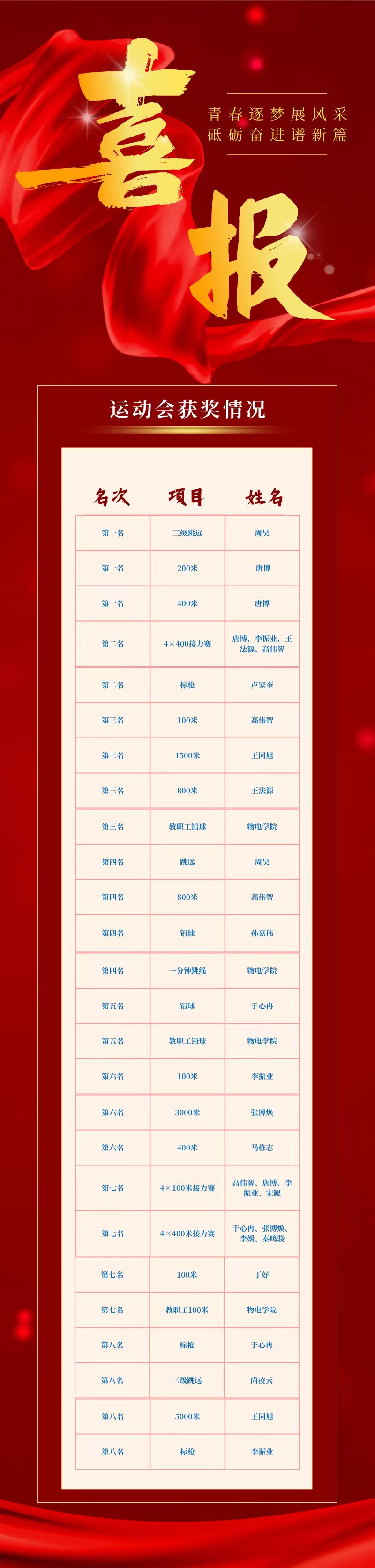 无运动,不青春。党的二十大报告指出“要促进群众体育和竞技体育全面发展,加快建设体育强国”,物电学子将继续秉持“文明其精神,野蛮其体魄”的追求,以运动强健体魄,以科创启迪思维,在科研与赛场的双重舞台上,书写更多超越自我、追求卓越的精彩篇章,让物电的智慧之光,照亮每一次奋进的征程,共赴激情澎湃的未来!