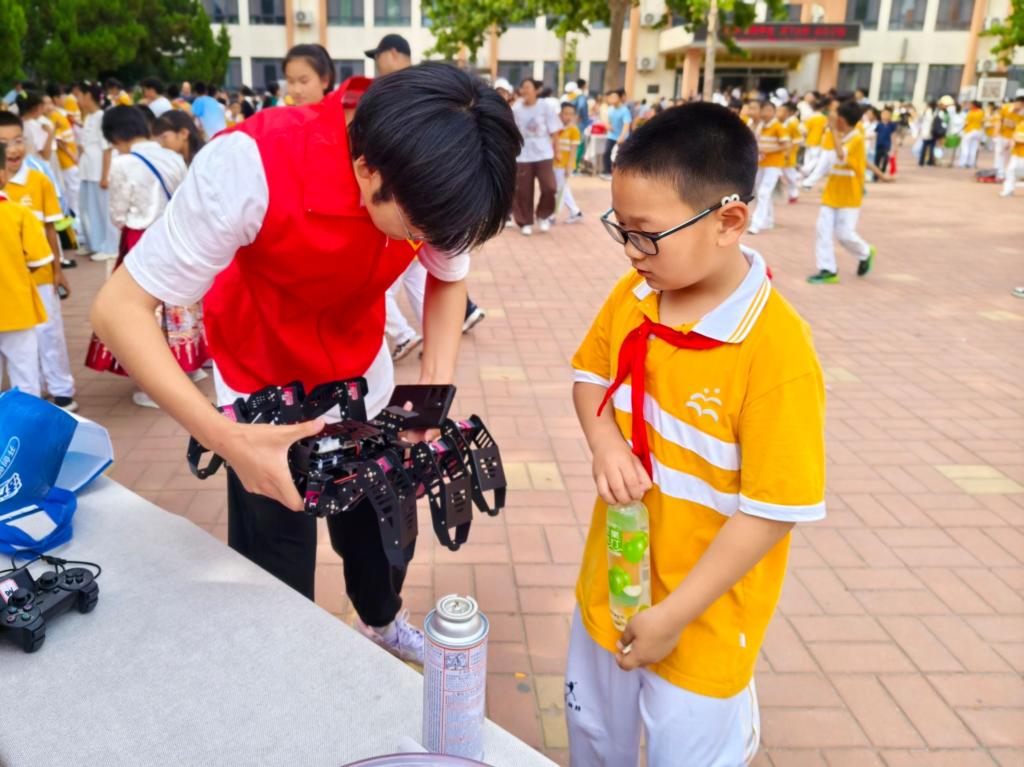 活动现场,“火焰掌”实验以震撼视觉效果率先登场。志愿者们基于严谨的化学配比与安全防护方案,将液态燃料在掌心点燃,瞬间升腾的蓝色火焰与转瞬熄灭的奇妙过程,既展现了化学反应的磅礴力量,又诠释了科学实践中的精准把控。小朋友们屏息凝神,深刻感受到了化学反应的魅力,也体会到科学实验中严谨操作的重要性。同时志愿者们操控着形态各异的机器人,以编程指令赋予其灵动“生命”——机械臂精准抓取物件,理论知识通过实践传播。小朋友们踊跃参与操控体验,在指尖触碰中感知人工智能与自动化技术的精妙,好奇心与求知欲被充分激发。