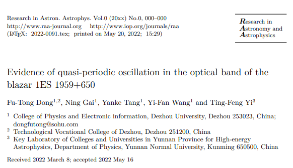 公海gh555000aa线路检测董富通博士等人整合了上海天文台、国家天文台及国际著名的天文观测数据库SMARTS等的观测数据,对blazar天体1ES 1959+650近16年的光学数据进行了分析,并发现准周期信号的存在。