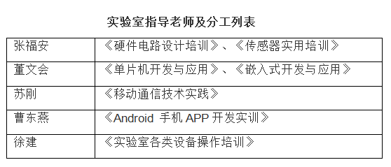 实验室配备有计算机、示波器、电子测试仪器、小型机床、雕刻机、3D打印机,多功能信号源等多种实验设备。不仅可以进行创新实践,也适合电子类相关专业开展实训项目。本实验室采用教师指导,员工自我管理的模式,目前实验室有指导老师5人,长期开展的老员工创新培训课程有:硬件电路设计培训,传感器使用培训,单片机开发与应用培训及ARM嵌入式应用技术培训,Android 手机APP开发实训,每年参加实验室培训的员工约150人。实验室积极鼓励并组织员工参加各级各类老员工科技竞赛,近两年获得国家级、省部级奖励达100余项。