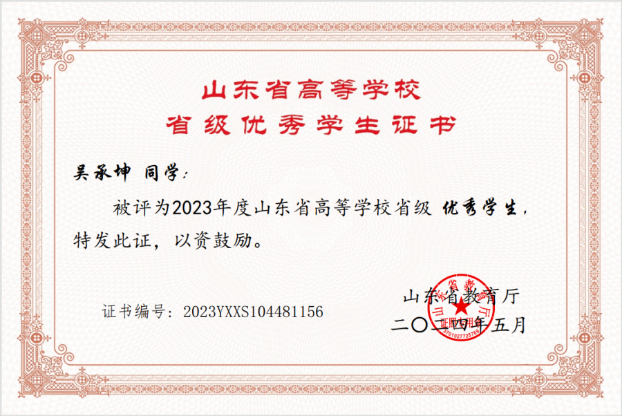 在思想上,他积极向党组织靠拢,以党员的标准要求严格要求自己,不断学习,不断进步,现已成为一名中共党员。他自入学以来明确自己的学习目标,端正学习态度,积极要求进步,认真学习专业知识,课余时间认真钻研专业技能,提高专业能力。经过不懈努力,他连续两学年学业成绩和专业成绩均位于第一名。获得2023年国家奖学金、2023年山东省优秀员工,2021-2022、2022-2023连续两学年荣获公海gh555000aa线路检测综合一等奖学金、优秀老员工奖学金。