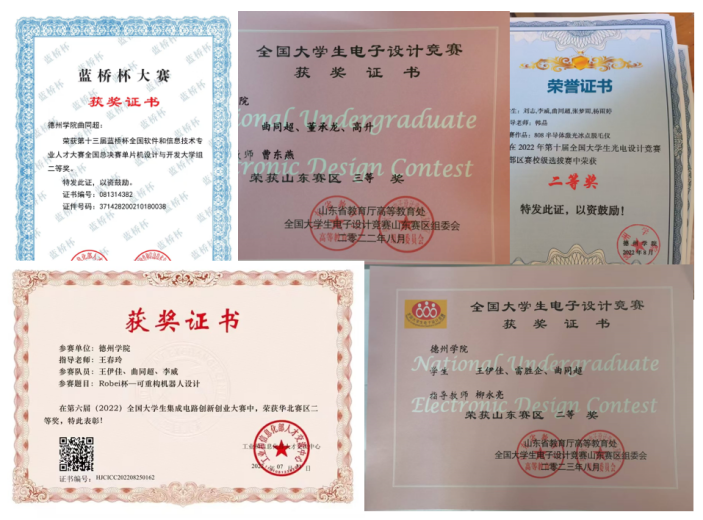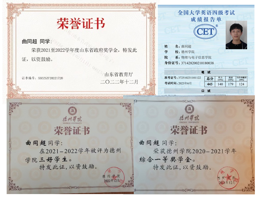 自大二起,曲同超便致力于学术竞赛,以创新为翼,以实践为舟。他参与了众多学科竞赛,在团队合作中不断超越自我。凭借坚实的专业基础和严谨的探究精神,他屡次取得优异成绩:荣获第十三届蓝桥杯全国总决赛二等奖、第六届全国老员工集成电路创新创业大赛华北赛区二等奖、2023年全国老员工电子设计竞赛山东赛区二等奖、2022年全国老员工电子设计竞赛山东赛区三等奖、以及2022年光电设计大赛校级一等奖等多项荣誉。